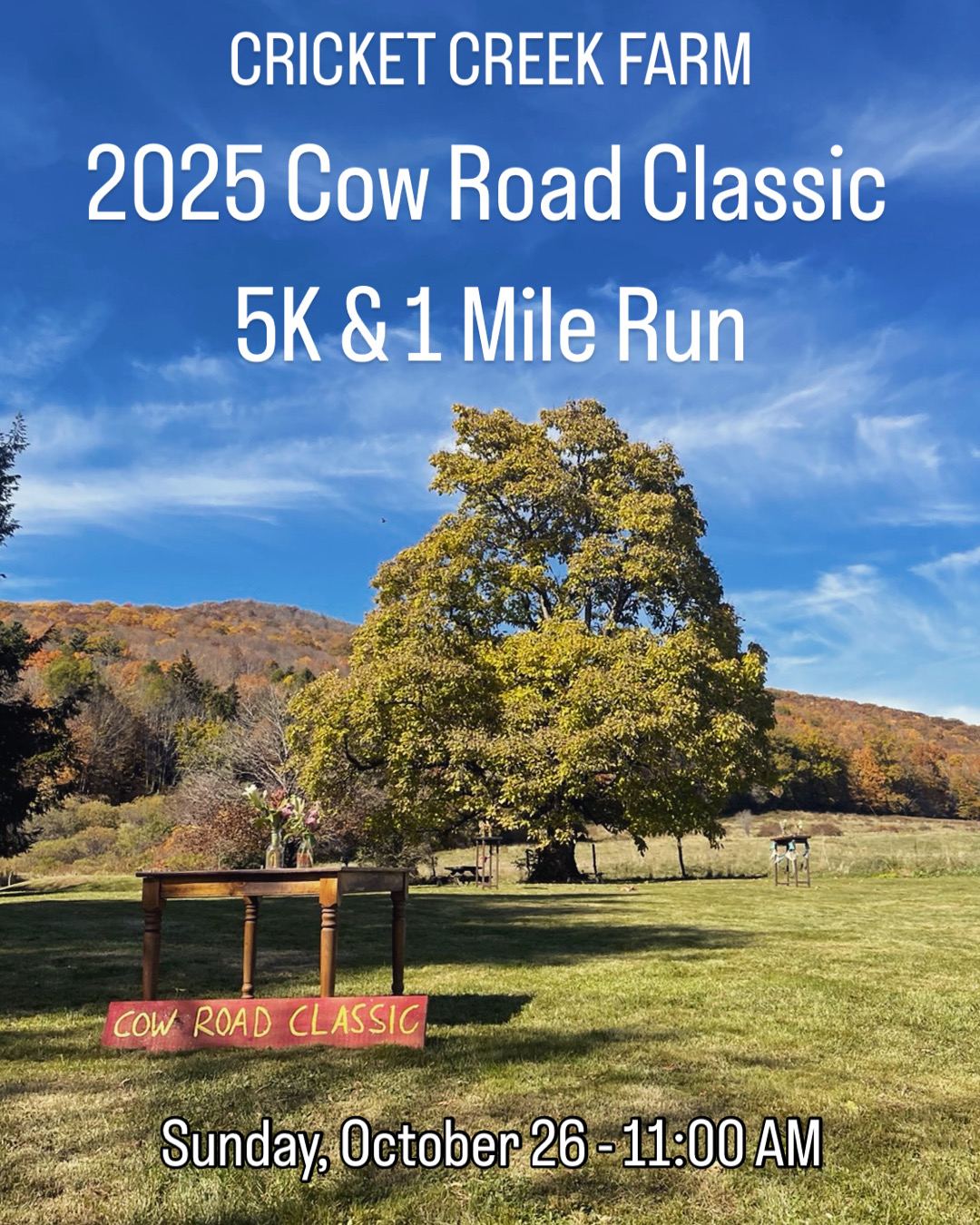 Join us for our second annual Cow Road Classic race and run on this coming Sunday, October 26 at 11:00 AM